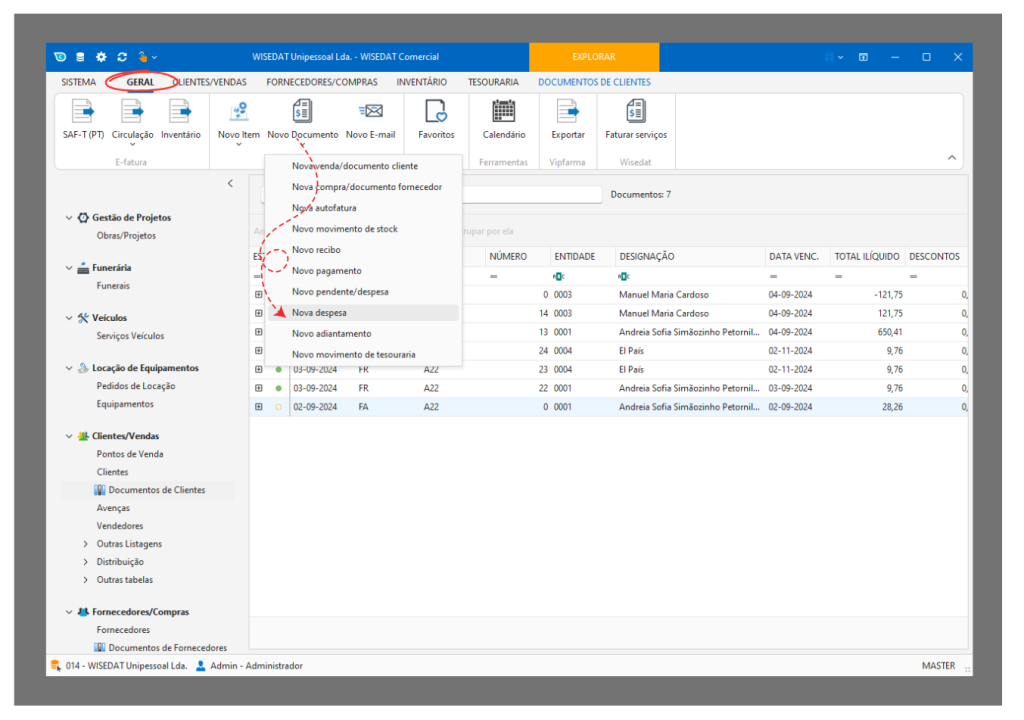 No WISEDAT Comercial no menu Geral | Novo documento | Nova despesa, selecione um dos documentos disponíveis.