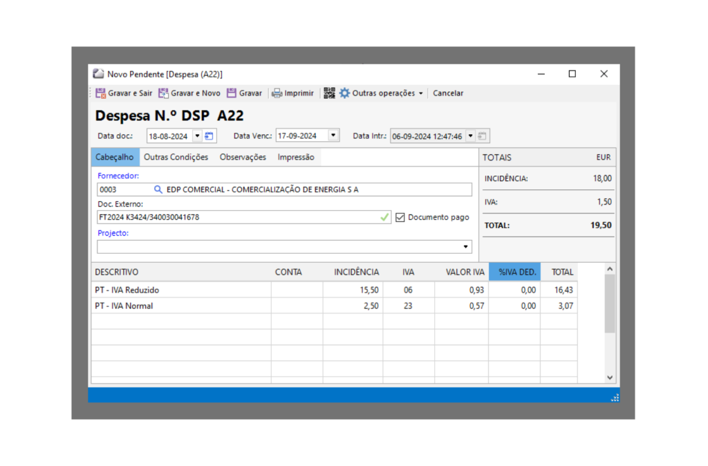 Na coluna Conta poderá indicar a alínea da conta correspondente, por exemplo: Internet, Telefone, Gasóleo, etc. Na coluna %IVA Dedutível poderá indicar o percentagem de IVA deduzir.